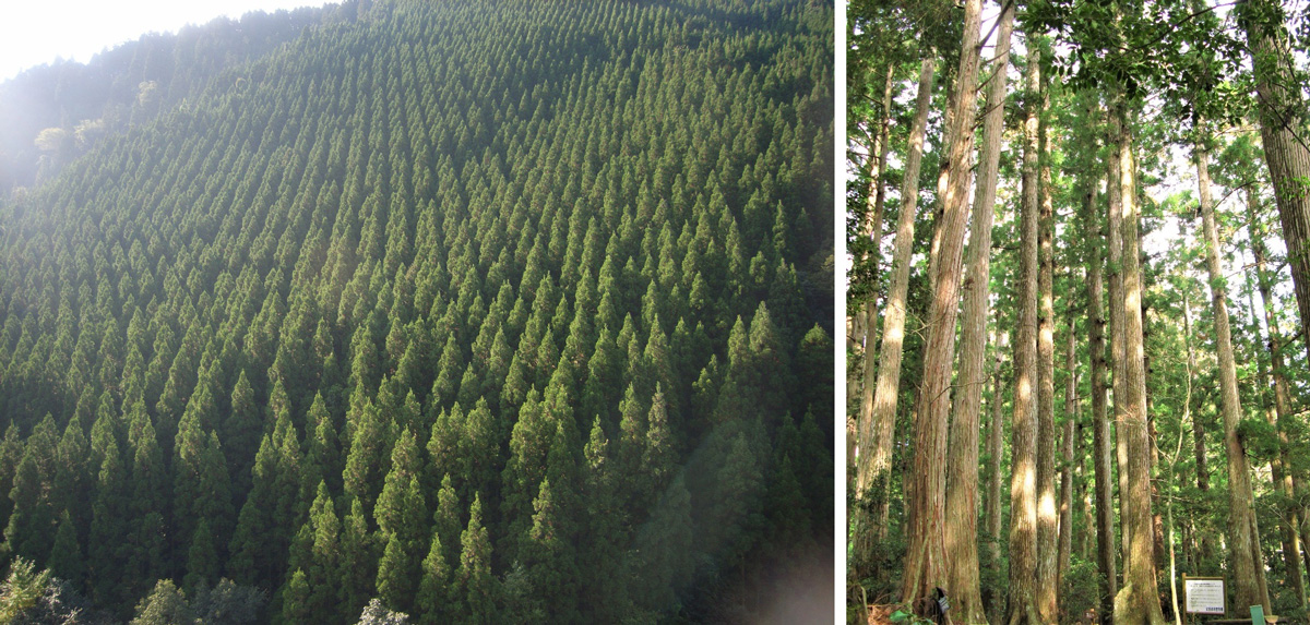 森林面積の4割を占めるスギやヒノキの人工林(下写真)は、野生動物たちにとって恵みの森