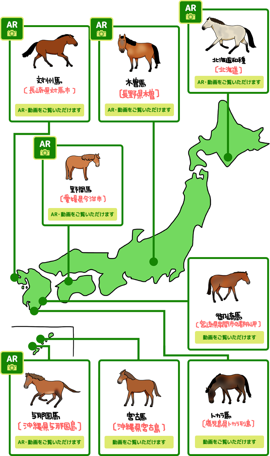 また日本には在来馬(下写真)が8種おり、モンゴル在来馬の祖先が朝鮮半島から対馬経由で